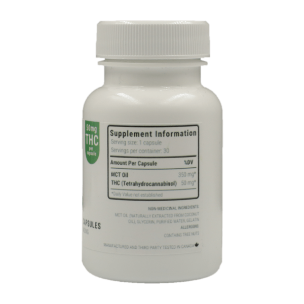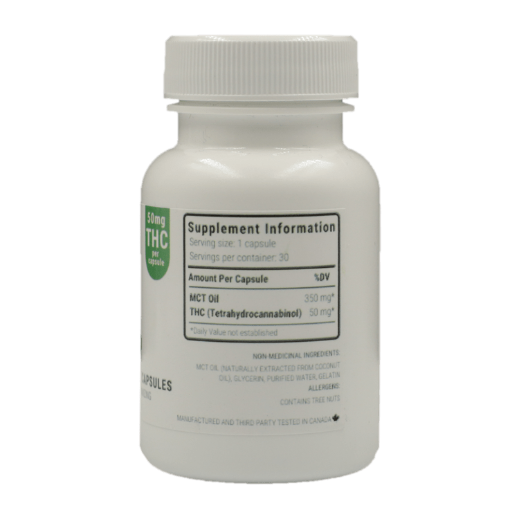 each capsule is 500mg (50mg THC)/ (350mg MCT Oil)